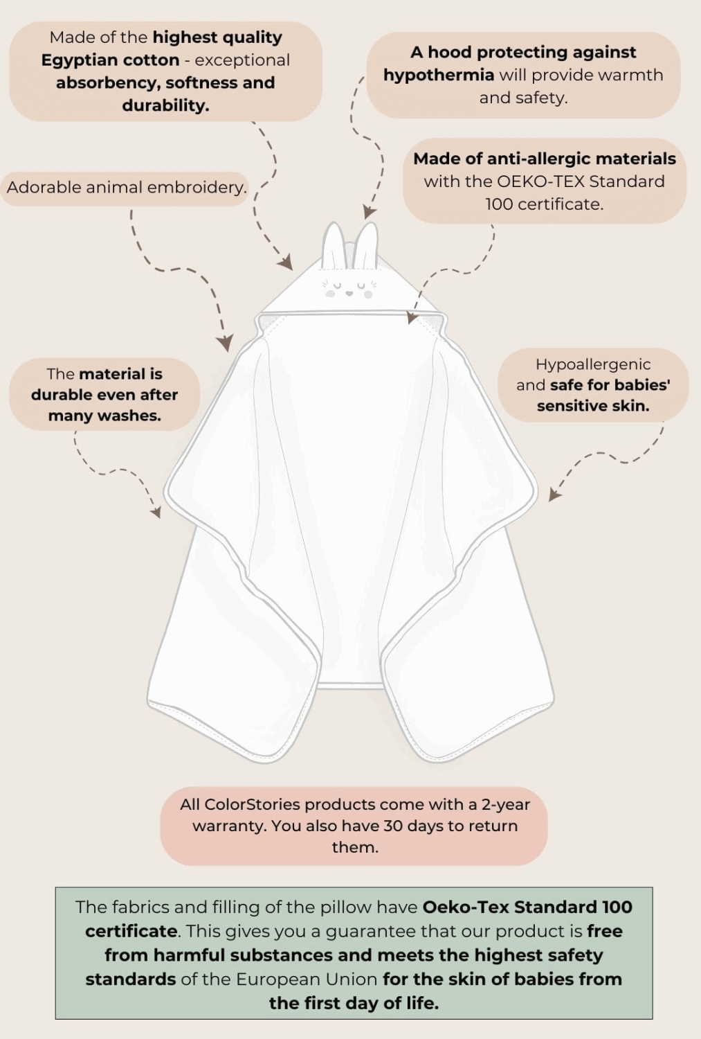 Το δέρμα ενός νεογέννητου μωρού είναι εξαιρετικά ευαίσθητο και επομένως χρειάζεται ιδιαίτερη φροντίδα μετά το μπάνιο. Στα μωρά δεν αρέσει να τρίβονται με πετσέτα και το ευαίσθητο δέρμα τους ερεθίζεται εύκολα. Γι’ αυτό οι πετσέτες μας με κουκούλα είναι κατασκευασμένες από εξαιρετικά απορροφητικό αιγυπτιακό βαμβάκι, το οποίο απορροφά το νερό αμέσως χωρίς να χρειάζεται έντονο σκούπισμα. Επιπλέον, η κουκούλα με κεντήματα χαριτωμένων ζώων όχι μόνο προστατεύει από το κρύο, τυλίγοντας το κεφαλάκι του μωρού με απαλότητα και ζεστασιά, αλλά κάνει το μπάνιο πραγματική απόλαυση.